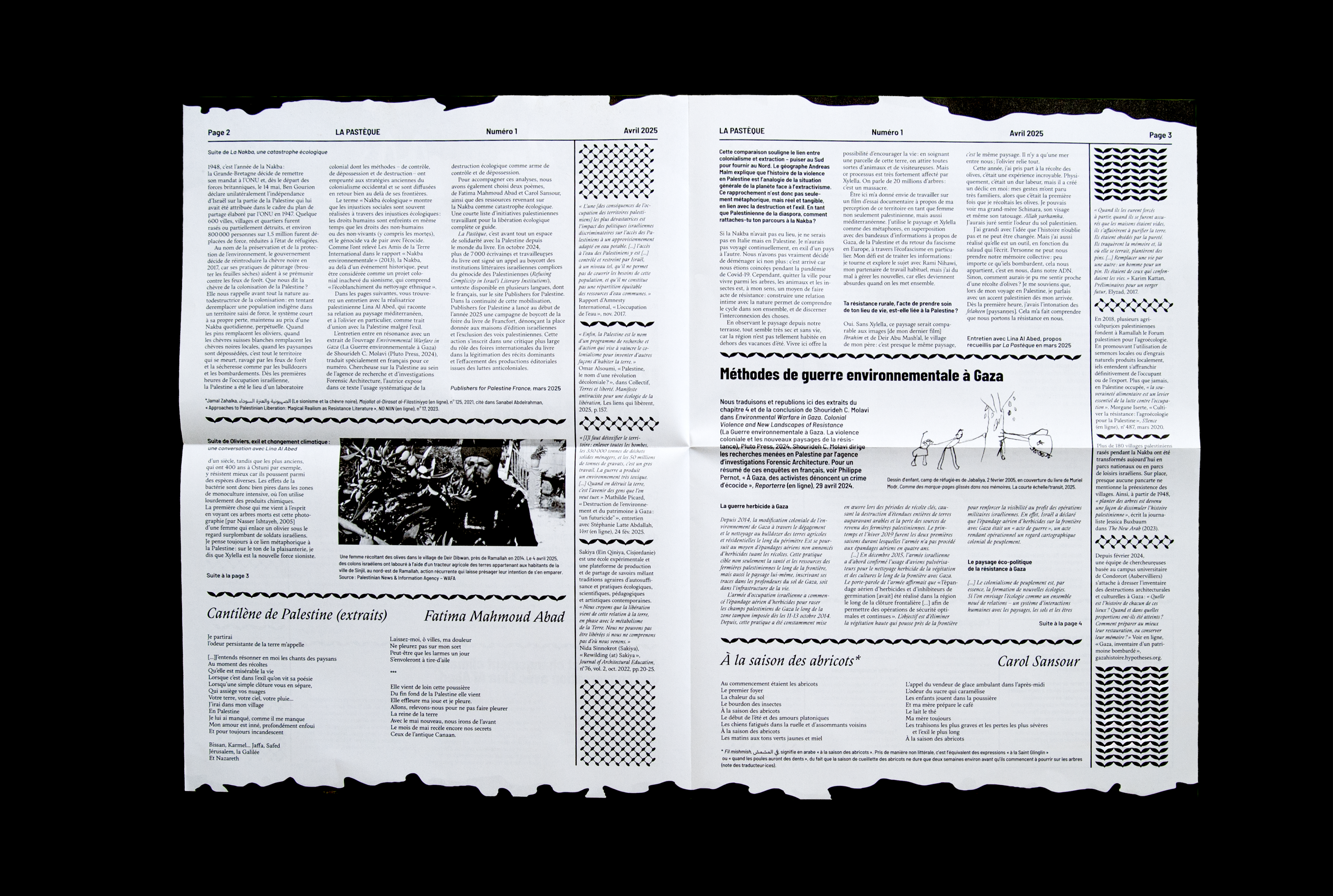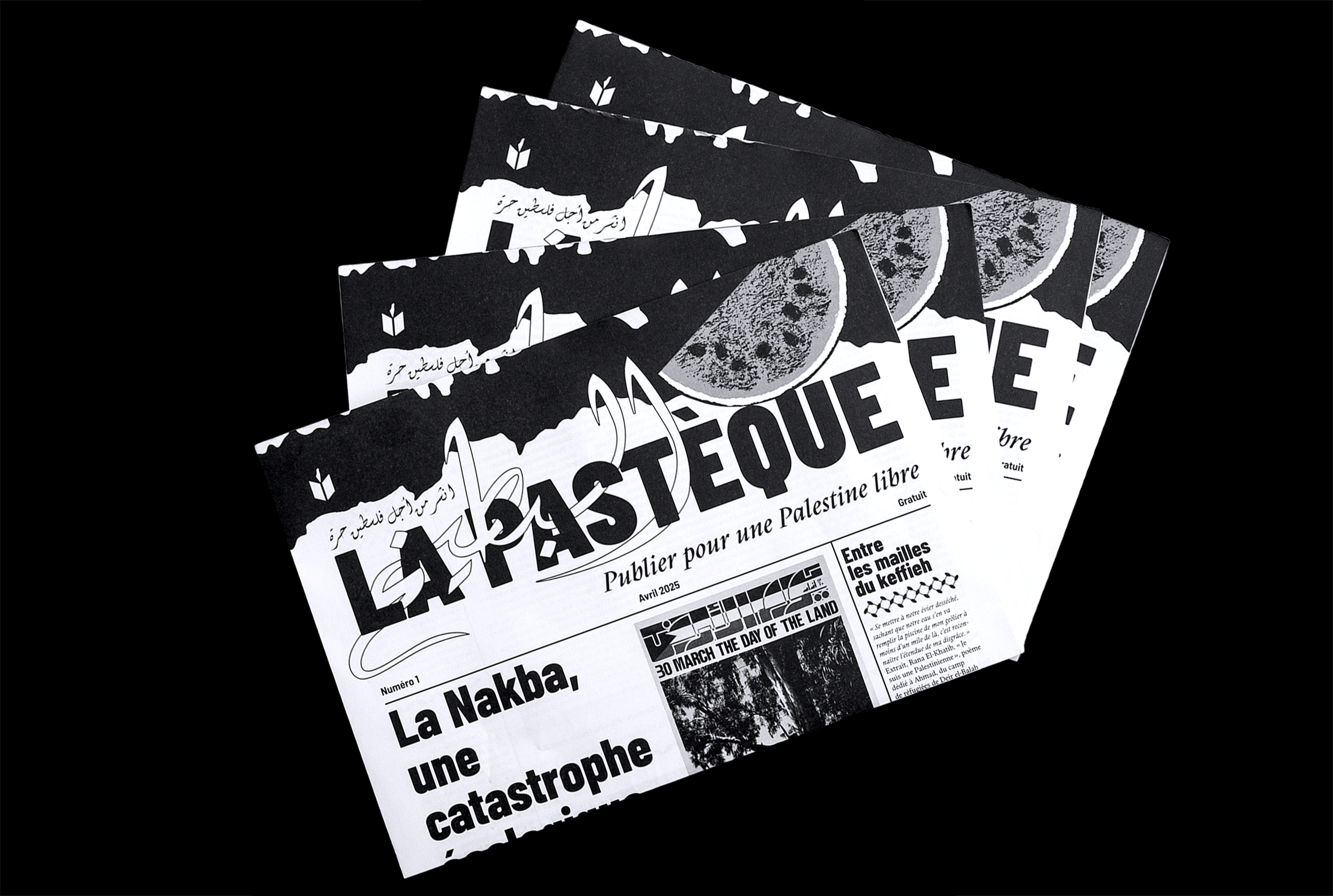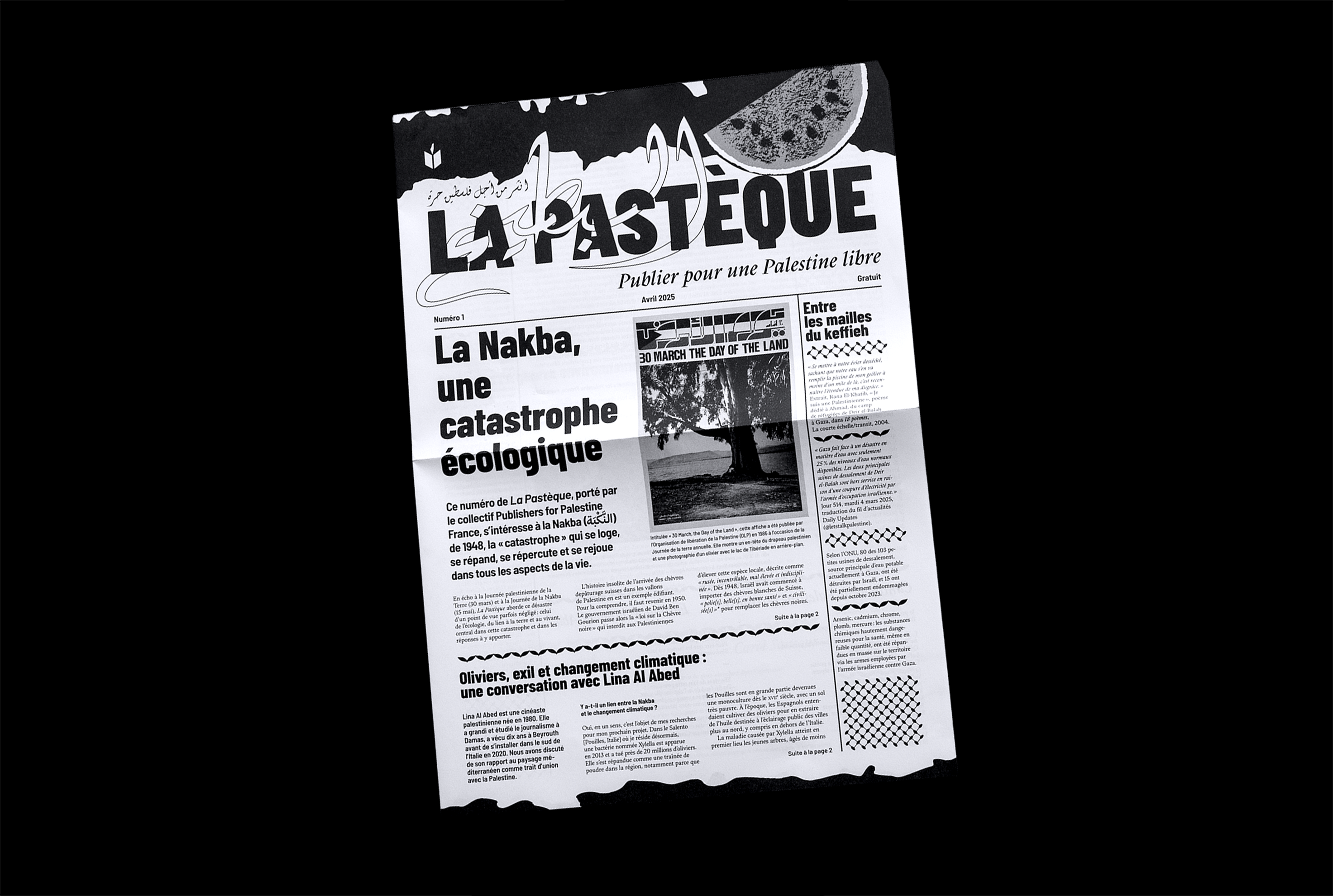 Graphic design and layout of issue No. 1 of La Pastèque, a free newspaper committed to the Palestinian cause, published by the Publishers For Palestine collective. This first issue addresses the subject through the prism of the ecological impact on Palestinian territory.