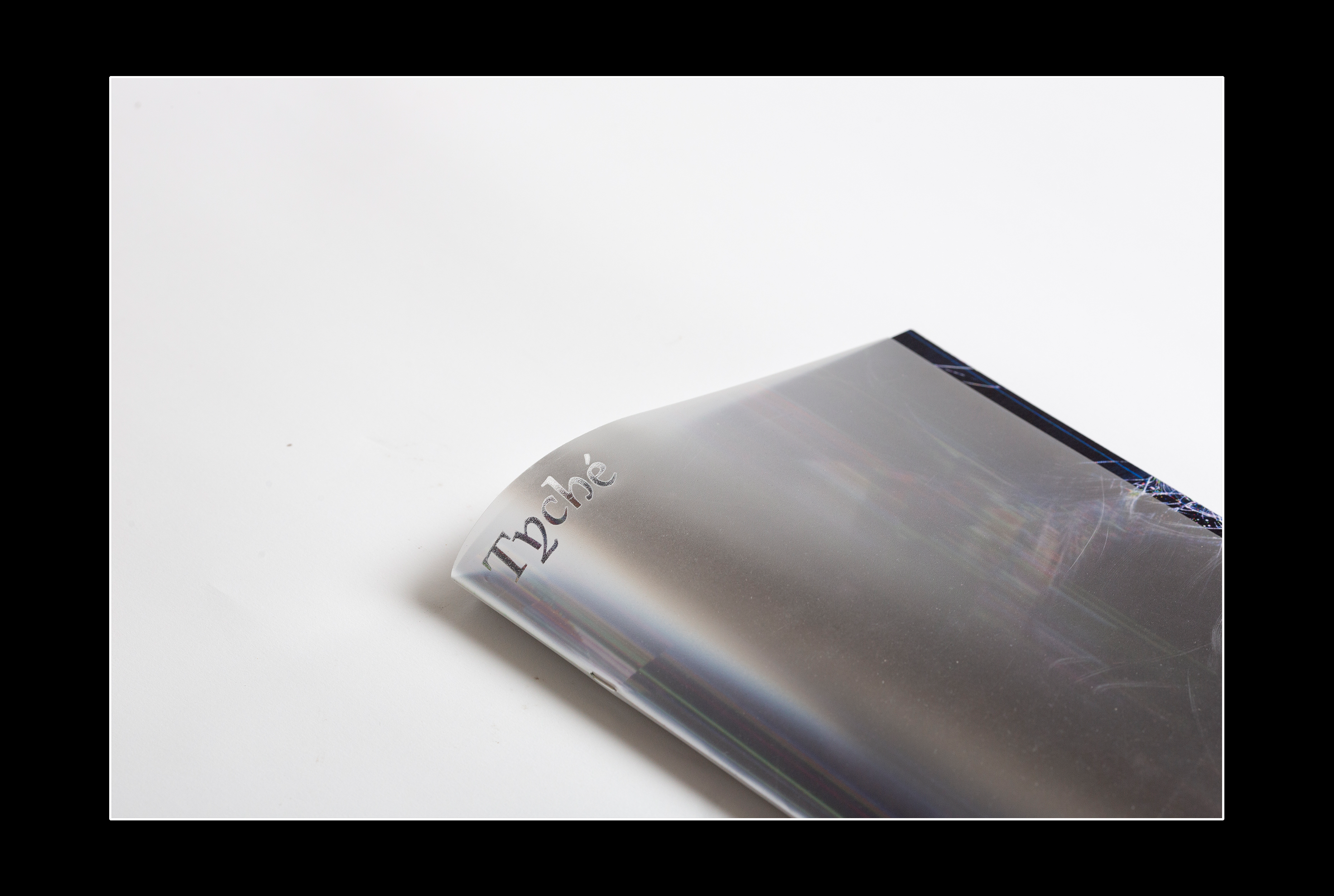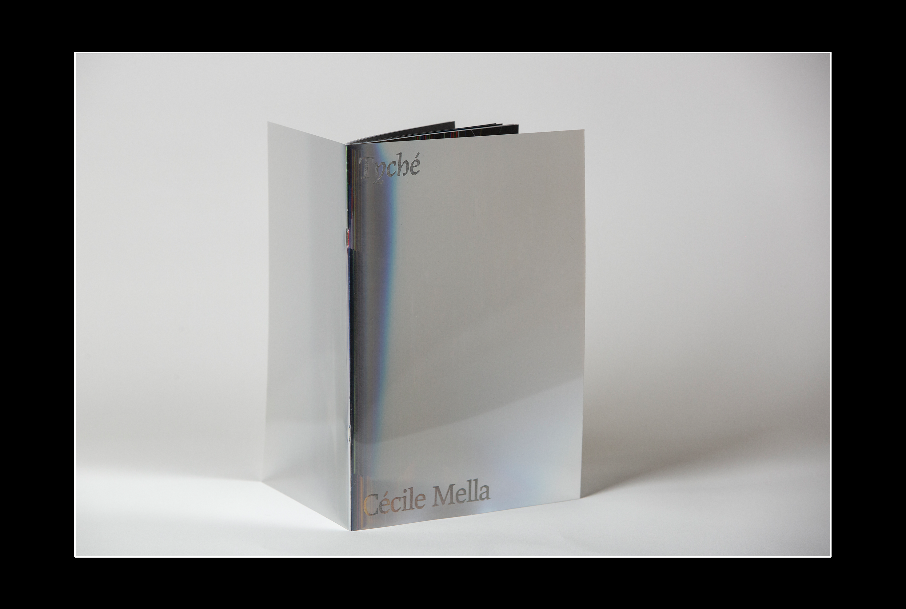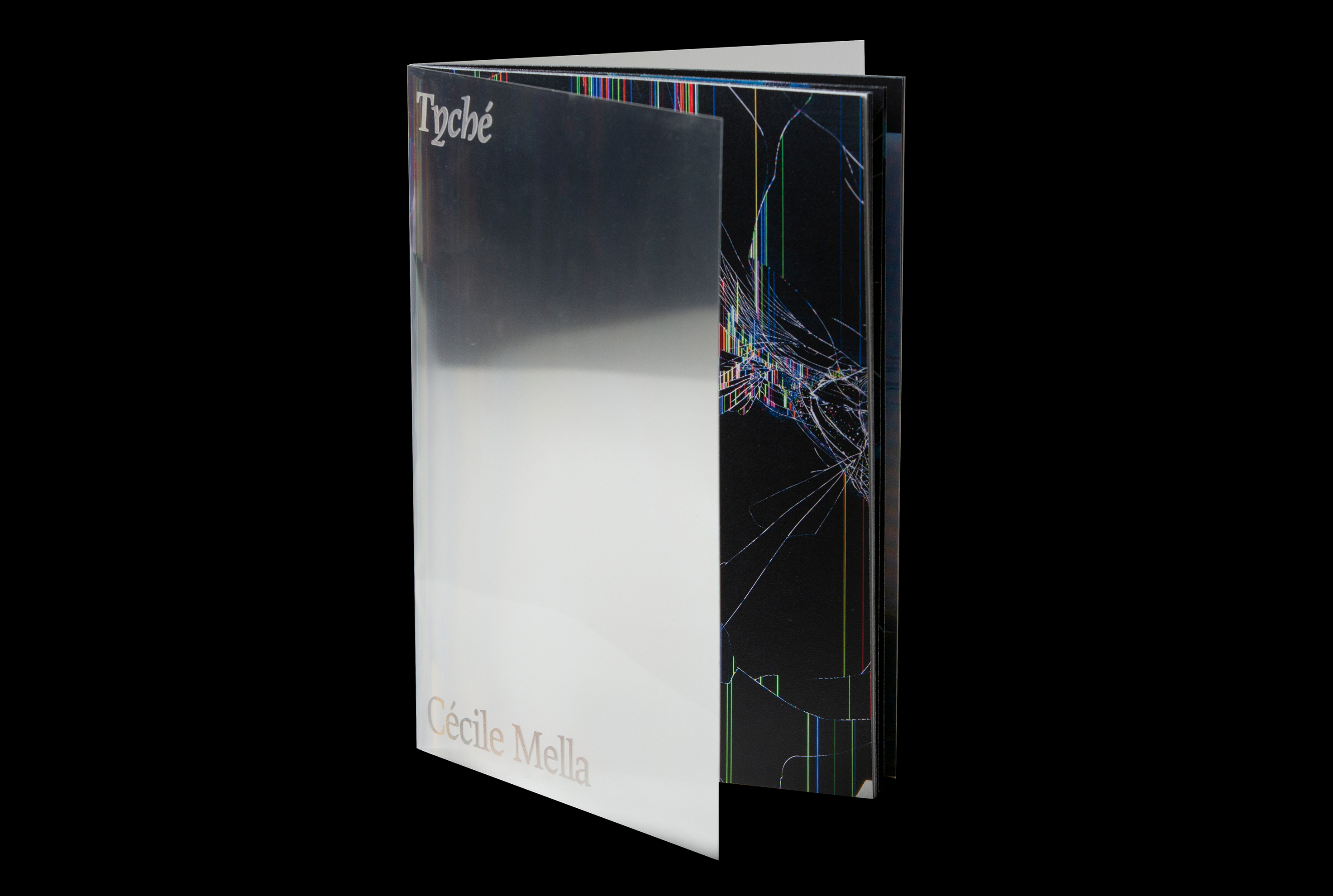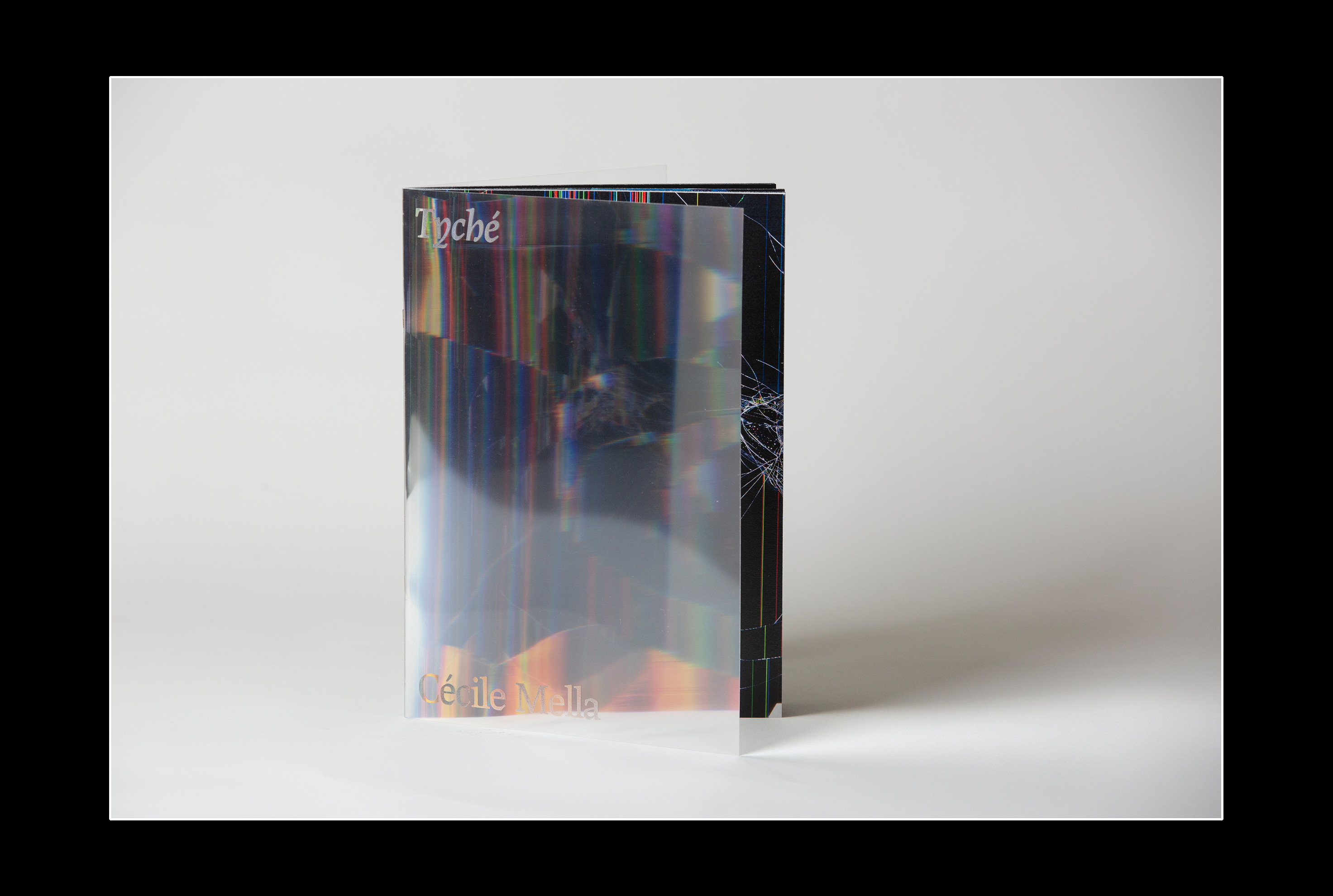 Art direction of the photography book Tyché, self-published by photographer Cécile Mella. Tyché questions our belief in images and the medium that best embodies them in today's world: the screen. Her project led her to collect damaged televisions and destined for recycling. When turned on, they produce patterns of light and pixels resulting from technological glitches. The book cover is made of prism film collected from screens, onto which the title has been laser engraved.
