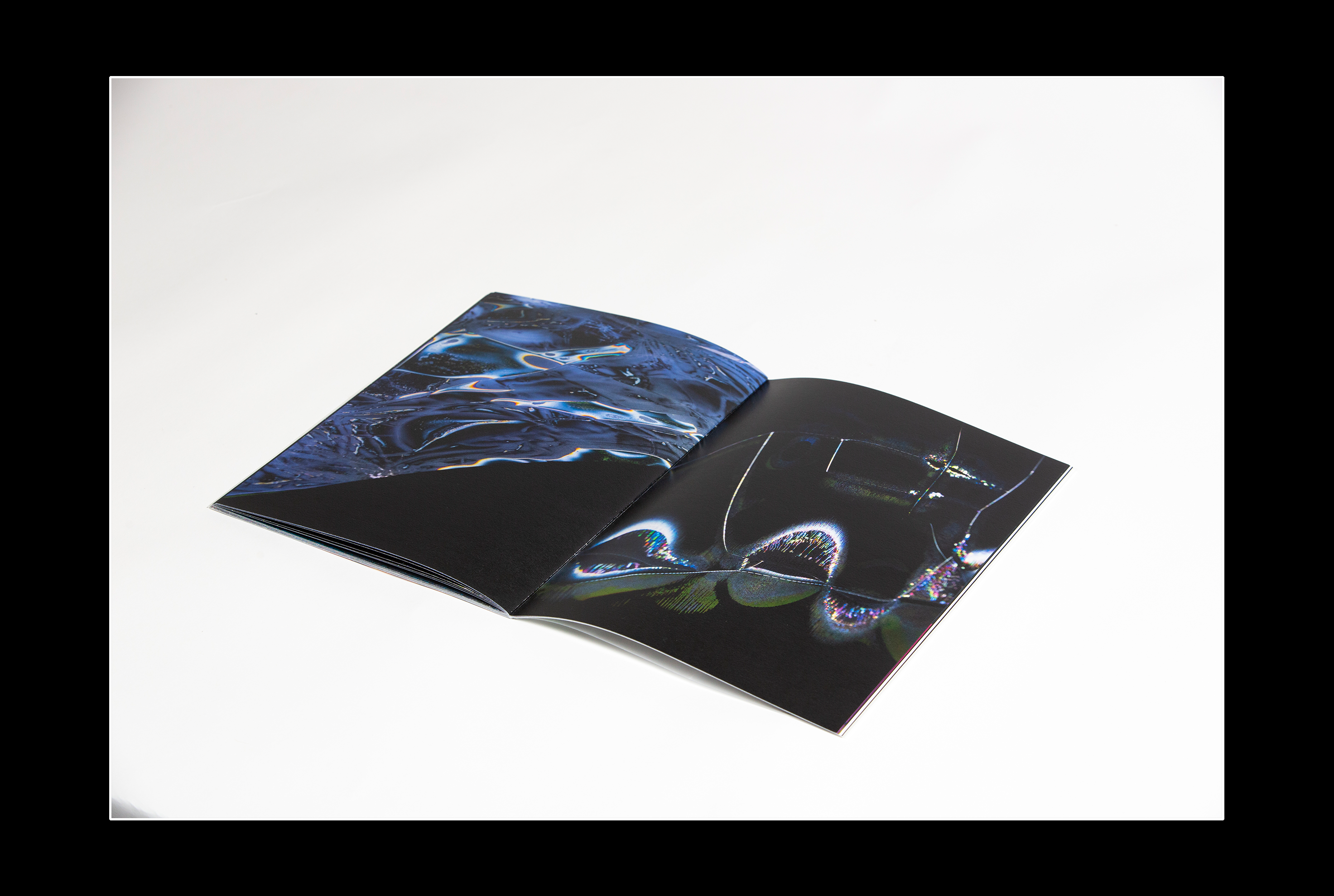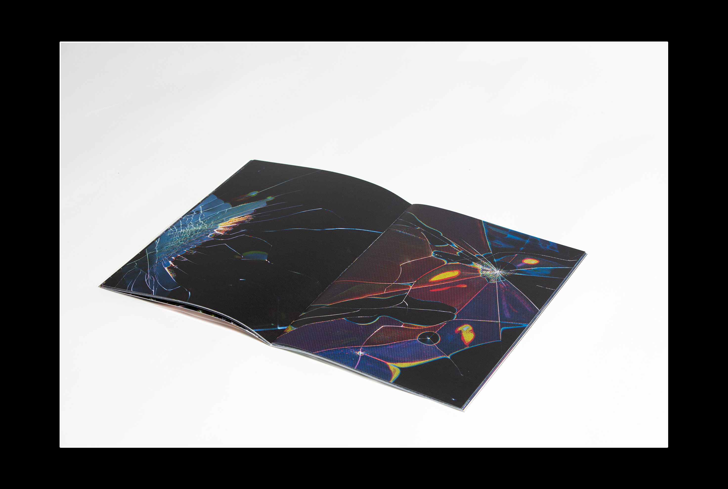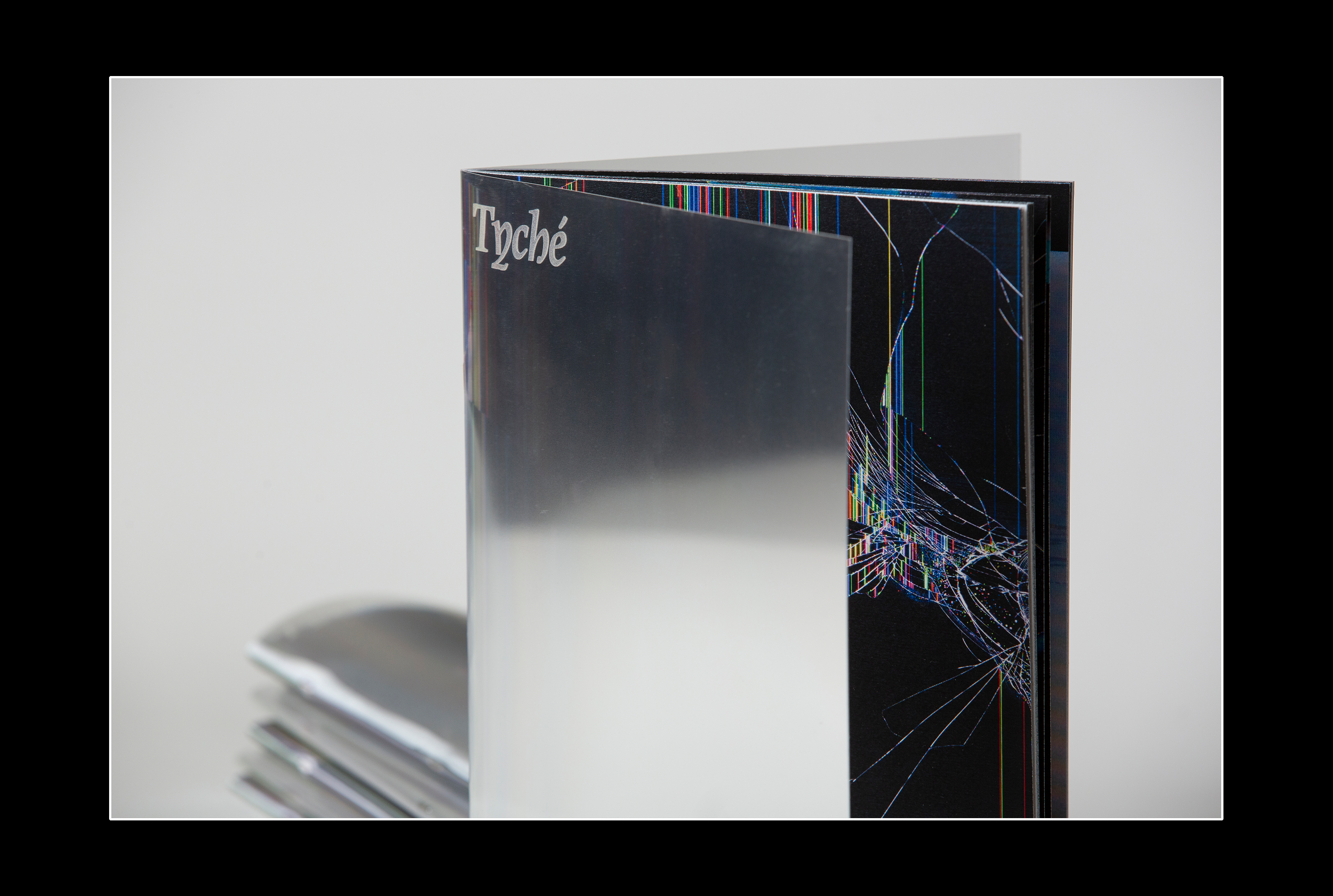 Art direction of the photography book Tyché, self-published by photographer Cécile Mella. Tyché questions our belief in images and the medium that best embodies them in today's world: the screen. Her project led her to collect damaged televisions and destined for recycling. When turned on, they produce patterns of light and pixels resulting from technological glitches. The book cover is made of prism film collected from screens, onto which the title has been laser engraved.